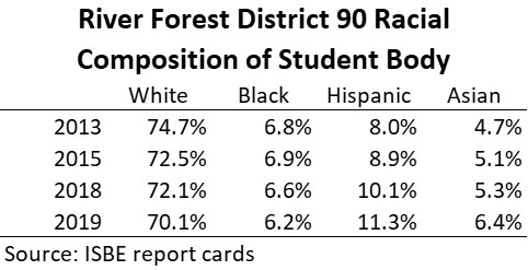 Before the initiative, all three River Forest schools ranked ‘Exemplary’ according to the Illinois State Board of Education. All schools were downgraded to ‘Commendable’ by 2019. Total enrollment at District 90 was 1477 in 2019.